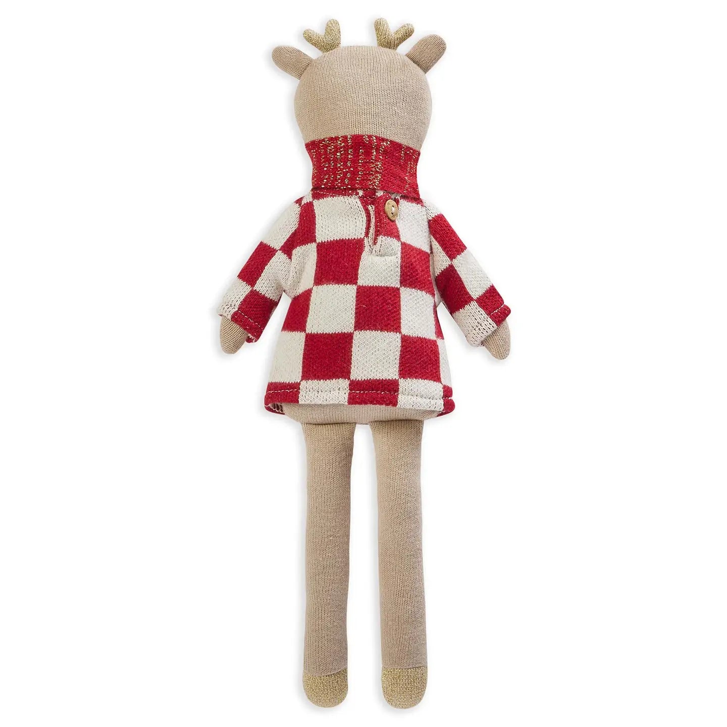 Meet your little one's new best friend, our knitted Reindeer toy. Snuggled up cosy and warm in a checkerboard jumper and scarf, featuring embroidered sparkly stars, a sweet red nose and metallic details on the ears and feet. Made from 100% organic cotton and recycled polyester filling, this toy is kind to the environment and soft for little one’s to snuggle up with.