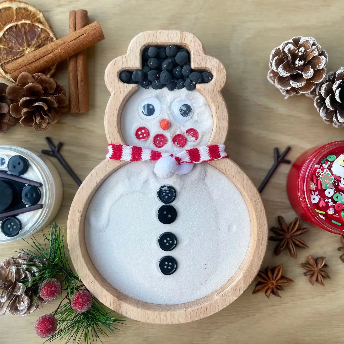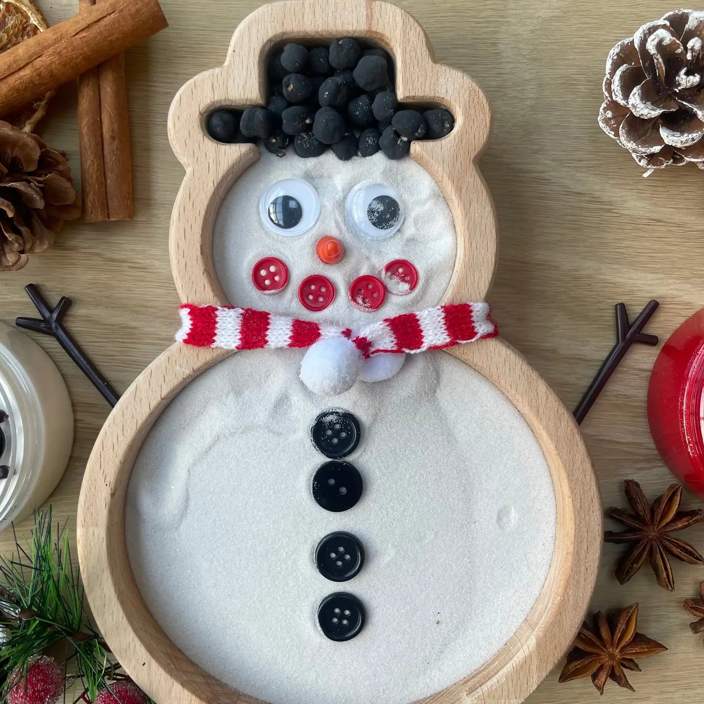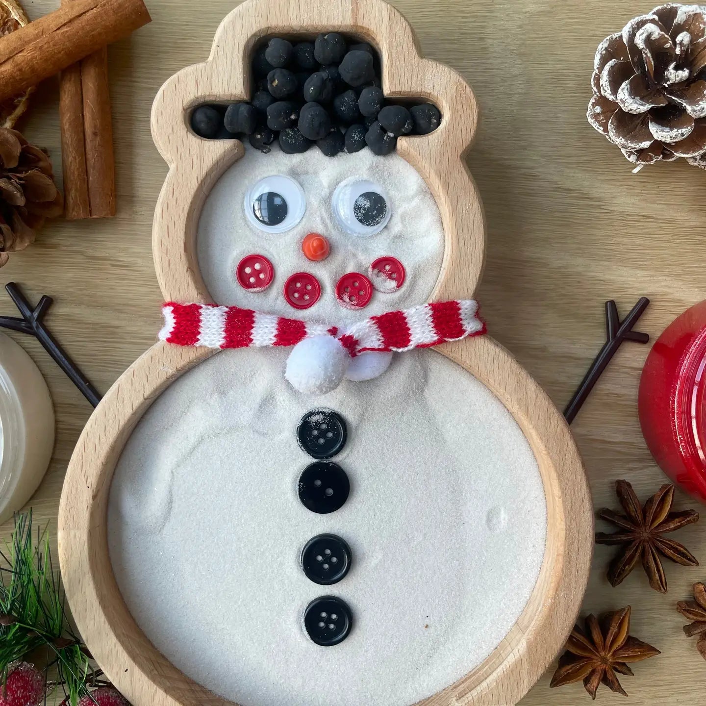Sourced from a local timber yard this beechwood hardwood is perfect for a snowman tray. Our trays are handmade from our very home workshop. Our chamfered edges make the tray unique and child friendly. Each tray is sealed using a ukca tested varnish. Why not add playdough, potions, sensory bases for your child to explore. To clean use a warm damp cloth. To prolong the life of your tray we advise regularly oiling. Do not expose wood to liquids for prolong periods of time as this can cause a slight warp in the underneath . Purchase the tray on its own or with the added extras for a full sensory experience. Extras include snowman loose parts, white sand, black chick peas. (Playdough not included) Dimensions : 220mm high 185mm wide 28 overall height 22mm depth tray