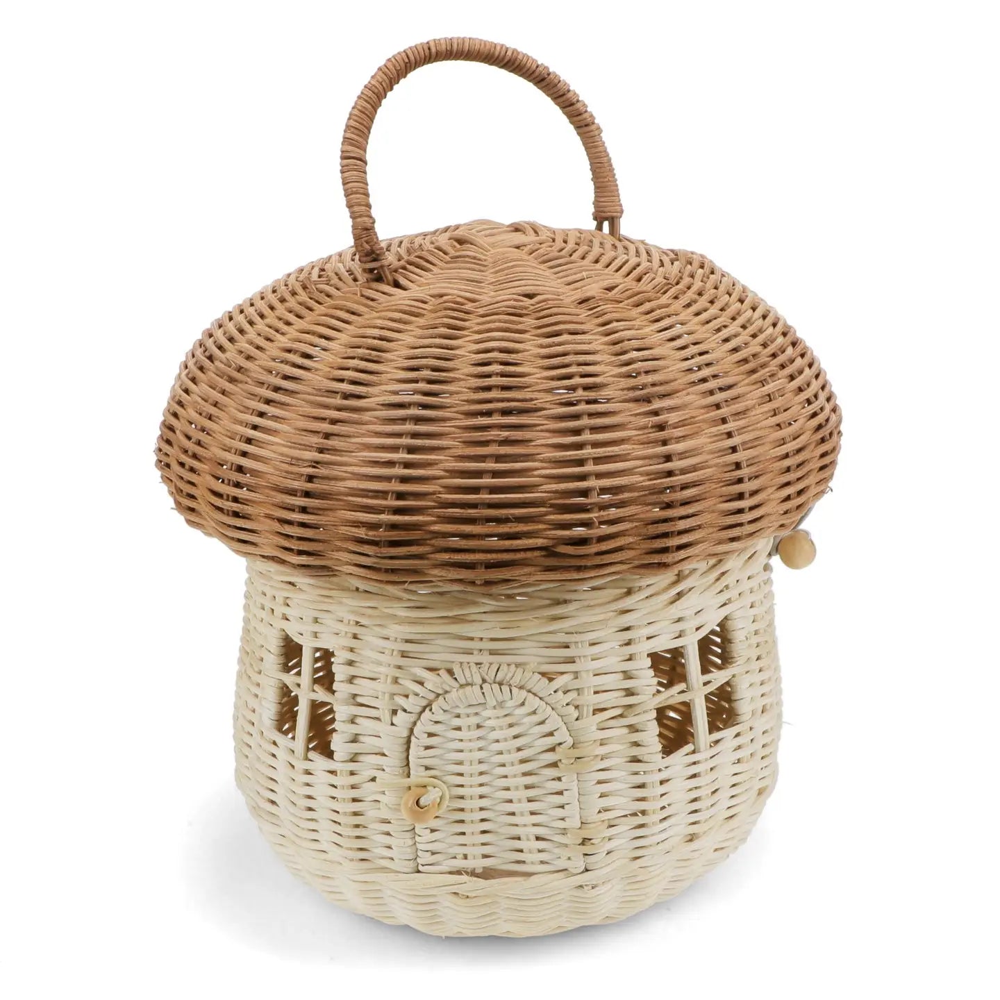 Decorative mushroom-shaped basket, made from natural rattan. The toadstool house design makes it a charming decoration for the house, shed or garden. The little door and the top of the mushroom can be opened and closed. • Measures 22cm (diameter) × 22cm (height excluding handle) • Door and lid are secured by elastic loops on wooden beads • Due to the handmade nature of this product, colours and sizes may vary. Packaging: • Card swing tag attached with twine. Safety information: • This item is for use as a decoration only. It is not a toy.