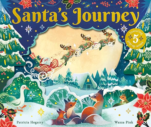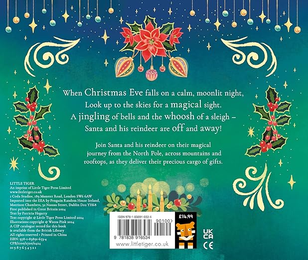 Join Santa and his reindeer on their magical journey from the North Pole, across mountains and rooftops, as they deliver their precious cargo of gifts. Lyrical rhyming text by Patricia Hegarty is paired with stunning illustrations by Wazza Pink to capture the magic of Christmas Eve! Gorgeous, layered pop-ups will enthral young readers, inviting them into Christmas scenes from sleepily sparkling rooftops to a cosy hearth with cookies and milk.